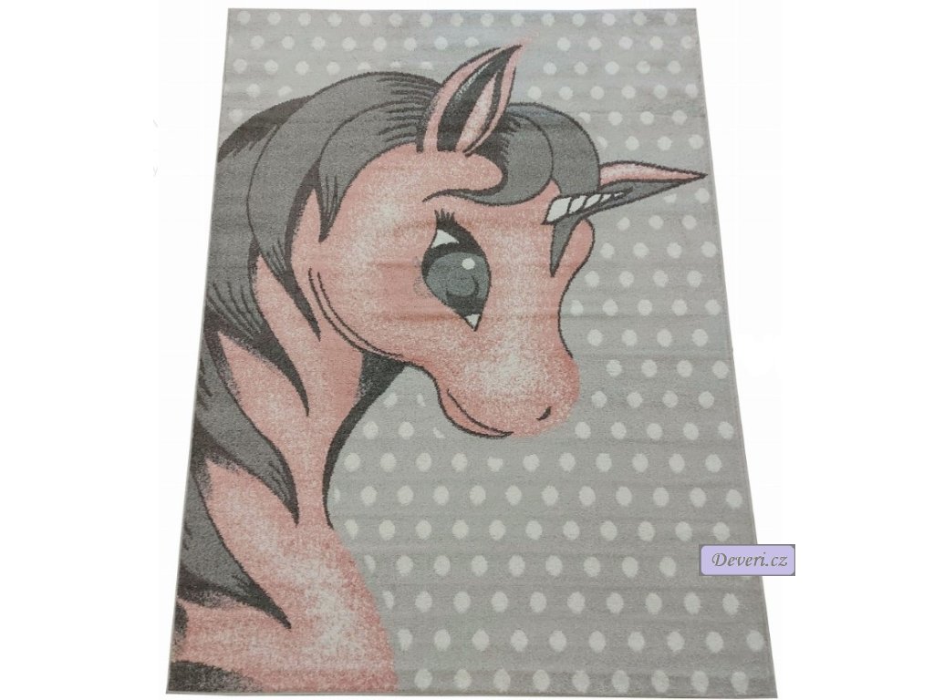 Hebký dětský koberec s růžovým jednorožcem na šedém podkladu. Měkký, odolný a vhodný i pro alergiky. Ideální pro hravé koutky doma i na krytém balkoně.