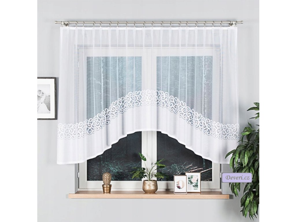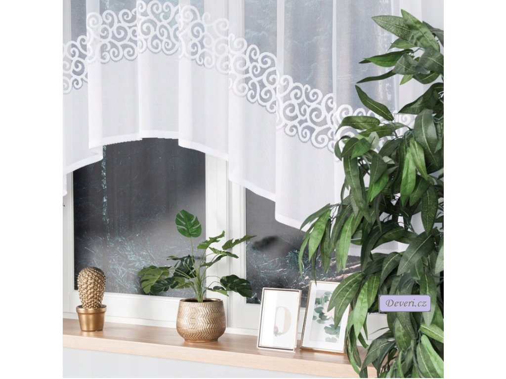 Záclona má šířku 300 cm a výšku 130 cm. Je obloukového tvaru, což vytváří jemnou linii okna a opticky odlehčuje prostor. Materiálem je kvalitní žakár, který je pevný, dobře drží tvar a přitom působí lehce. Barevné provedení je čistě bílé, celkový dojem světlý a svěží. Spodní část zdobí široká bordura s abstraktním vzorem, která dodává zácloně moderní charakter. Záclona je hotová, připravená k okamžitému zavěšení. Dodání probíhá do 5 pracovních dnů. Cena je uvedena za jeden kus.