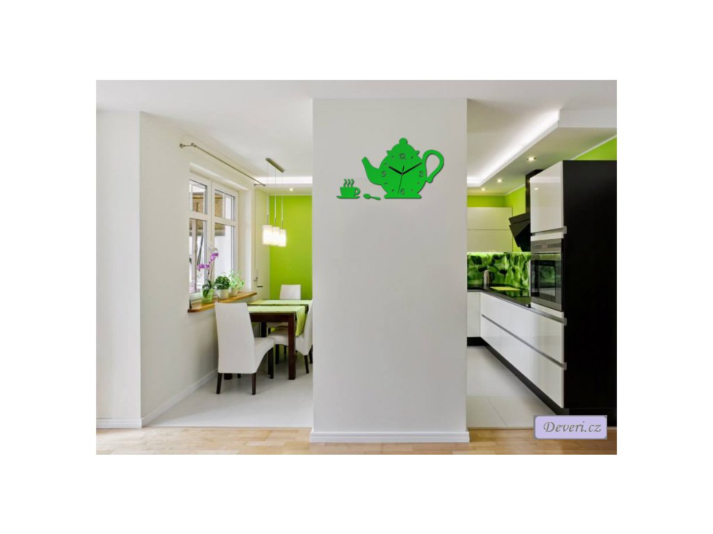 Originální nástěnné hodiny ve tvaru konvice, které vypadají vkusně v kuchyni nebo jídelně.