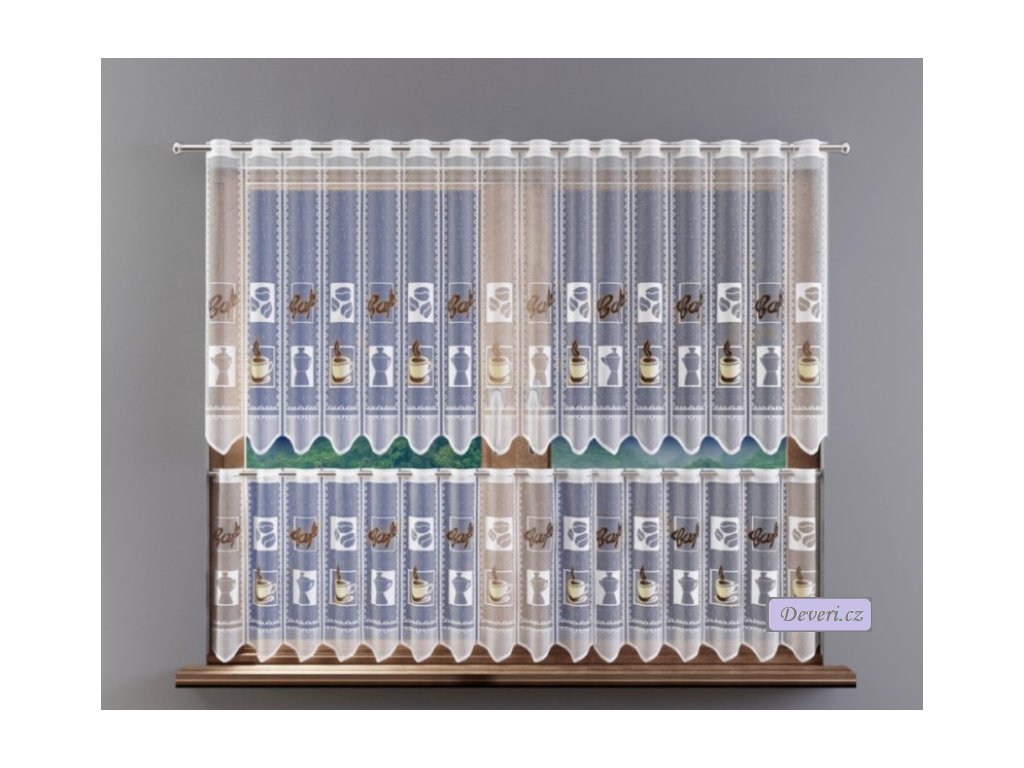 Lehká bílá záclona s motivem kávy, která propouští světlo a zútulní prostor. Ideální na vitrážku do kuchyně či pracovny. Šířku si zvolíte podle svého okna.