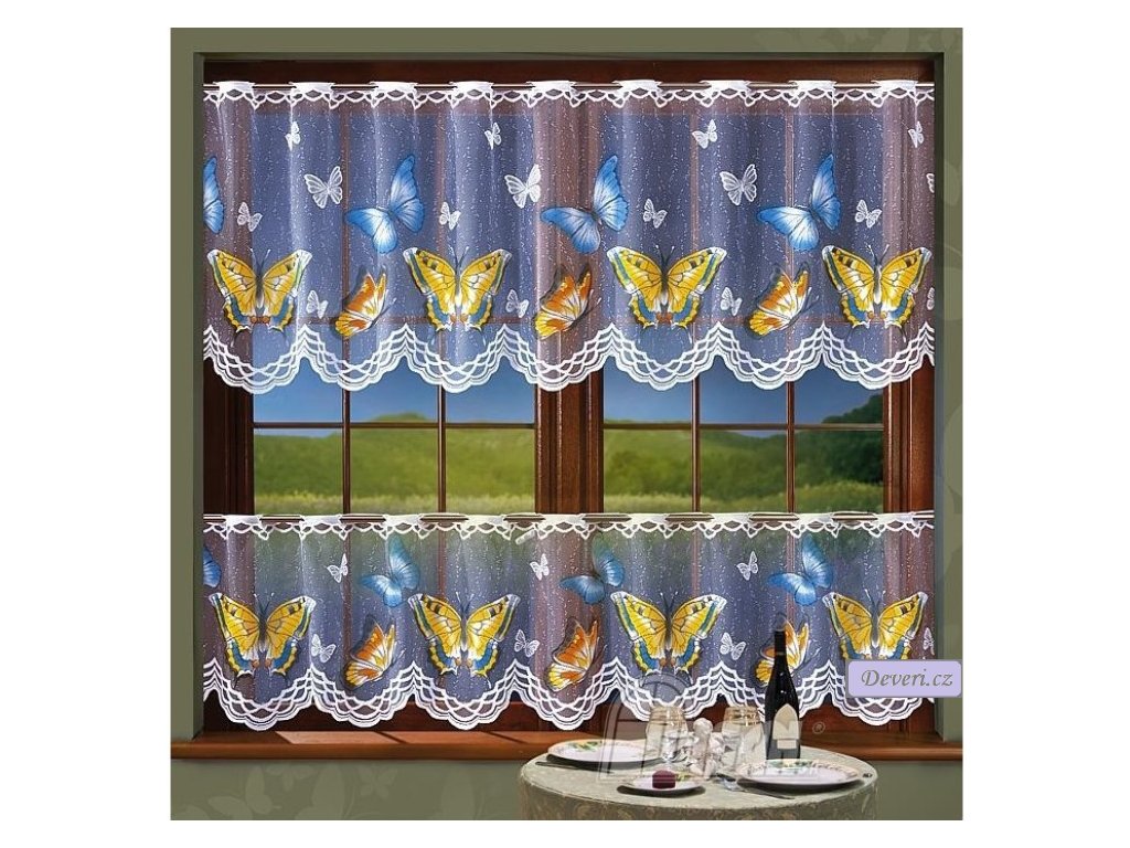 Jemná bílá žakárová záclona s motivem motýlků. Propouští světlo a hodí se do kuchyně i dětského pokoje. Šířku si zvolíte podle potřeby.