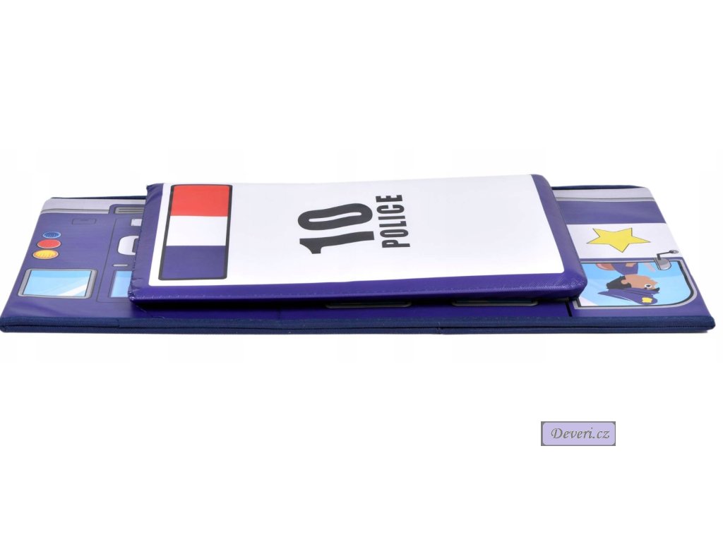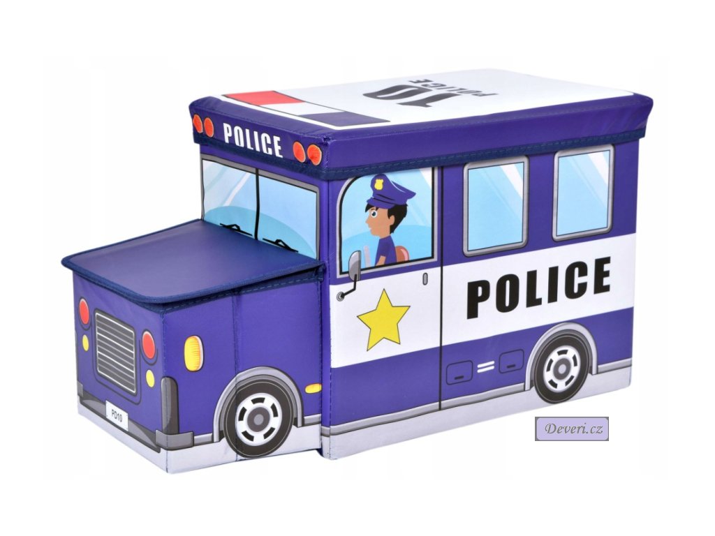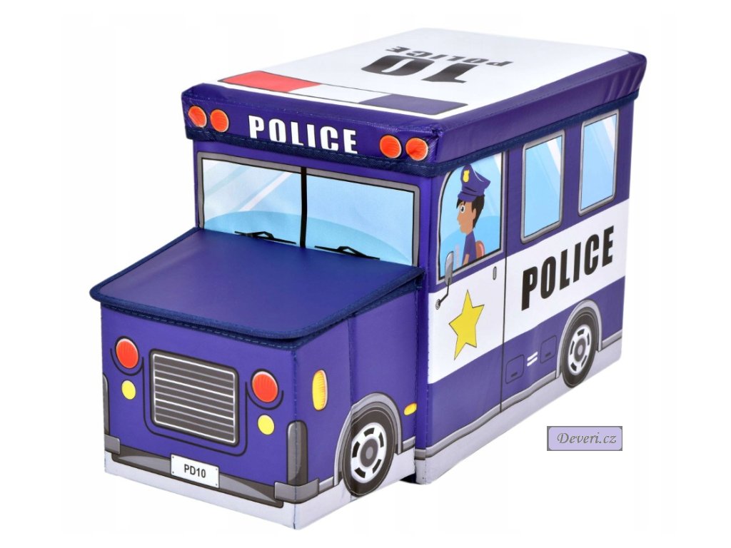 Hravý puf ve tvaru policejního auta ukryje hračky a poslouží i jako sedátko. Praktický a veselý doplněk pro každý dětský pokoj.