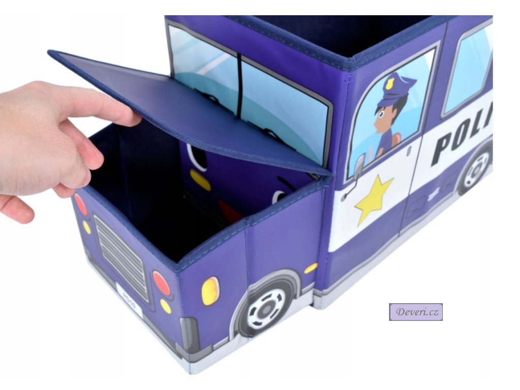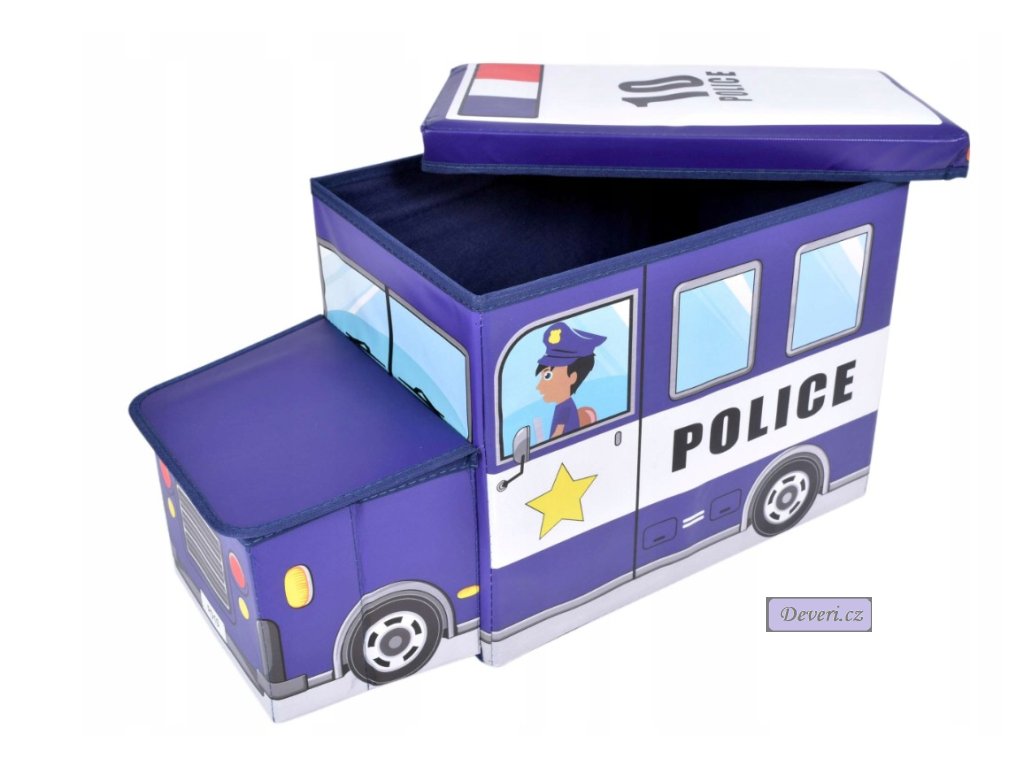 Box puf ve tvaru policejního auta je ideálním doplňkem do dětského pokoje i ložnice. Spojuje praktický úložný prostor s pohodlným sedátkem a díky veselým barvám podpoří radostnou atmosféru každého interiéru. Děti se budou těšit na uklízení hraček a pokoj zůstane útulný a přehledný.