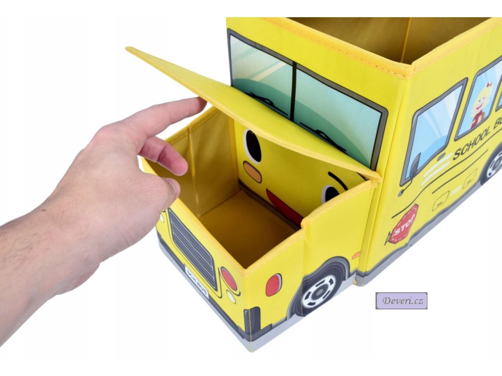 Žlutý box puf ve tvaru školního autobusu přináší chytré spojení úložného prostoru a sedátka. Díky veselému motivu děti uklízení baví a pokoj působí útulněji i přehledněji. Do dětského pokoje vnese radost, barvu a pořádek v jednom.