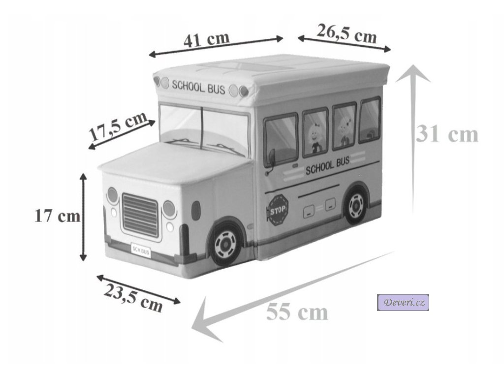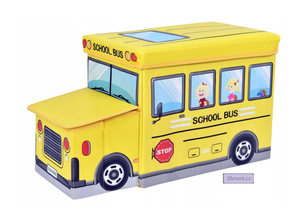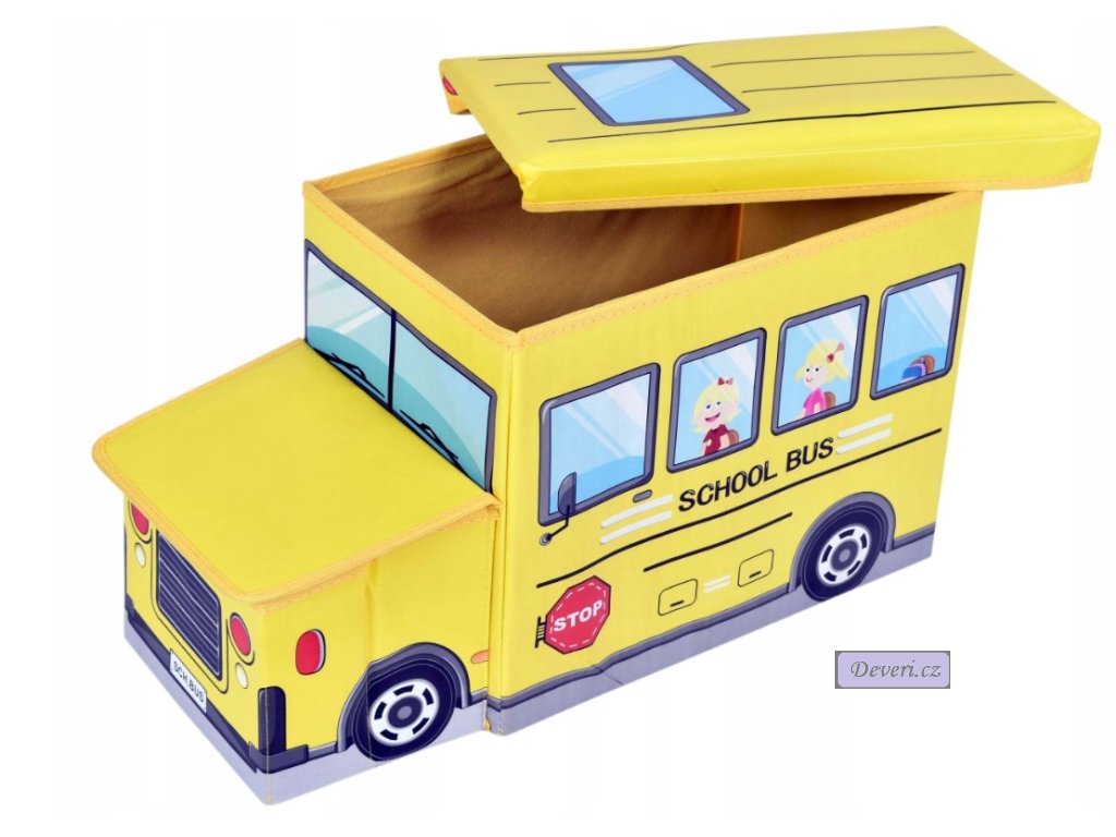 Box puf ve tvaru školního autobusu nabízí prostor na hračky a pohodlné sedátko. Praktický a hravý doplněk do každého dětského pokoje.